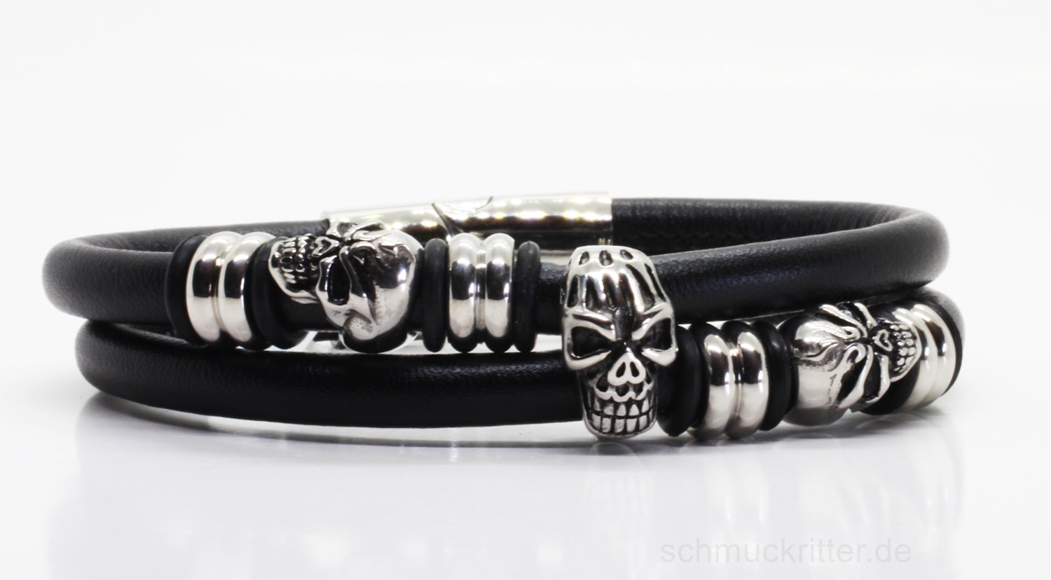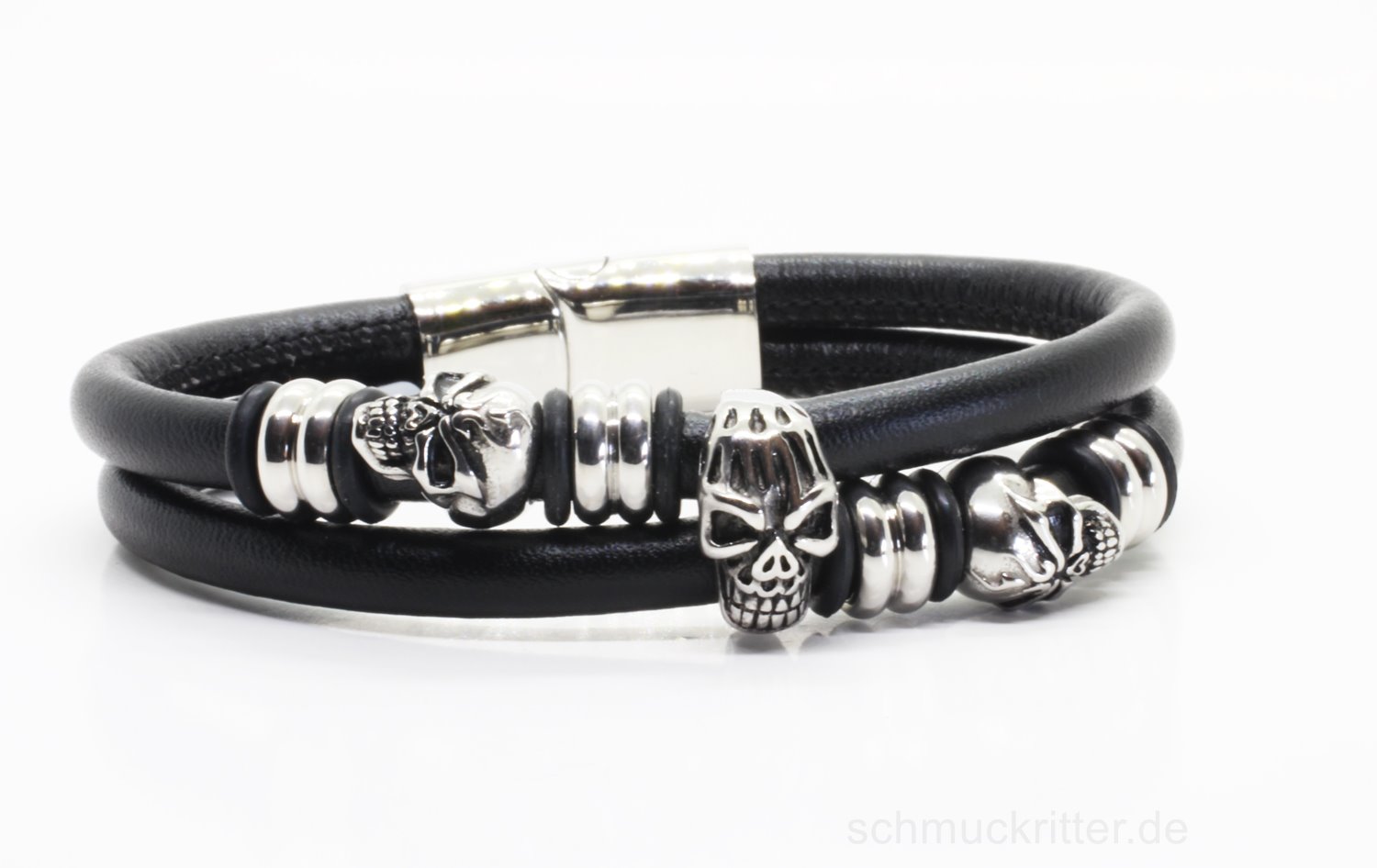 ausgefallenes echt Lederarmband mit Totenkopf Elementen in Edelstahl und einem kraftvollen Magnetverschluss